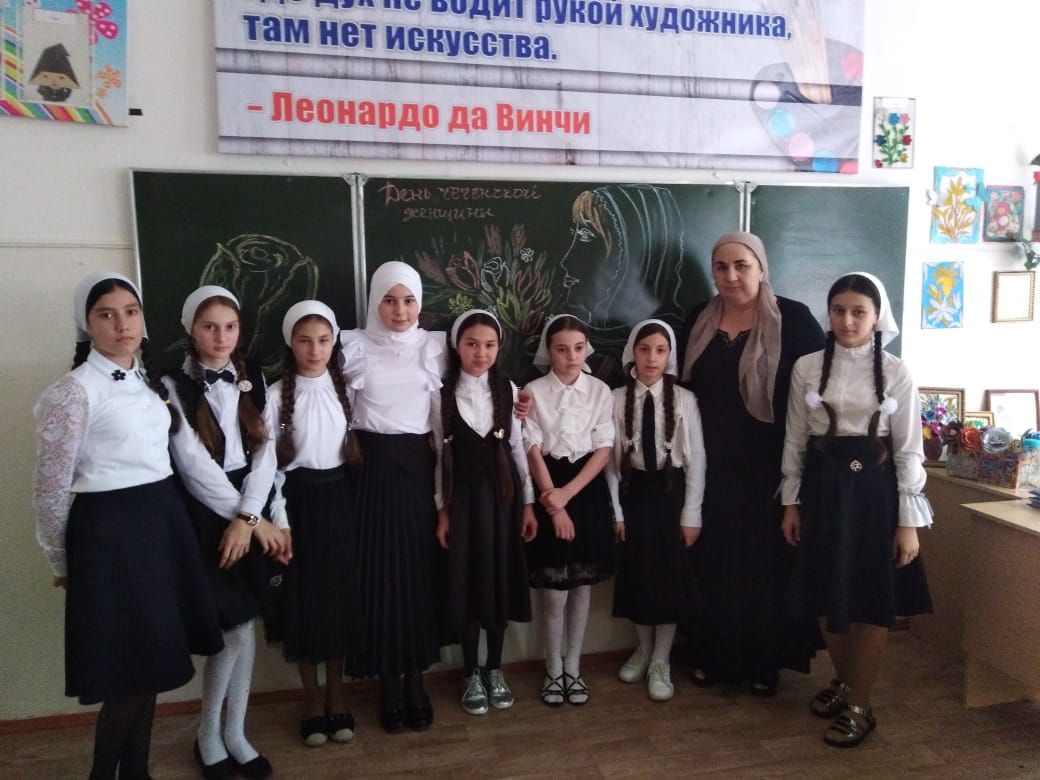 В соответствии с планом воспитательной работы утвержденного директором Акуевой Р.А. на 2019-2020уч.год. и во исполнения плана проведения мероприятий, посвященных празднованию Дня чеченской женщины, в целях усиления роли чеченской женщины в жизни общества в школе проведен цикл мероприятий.