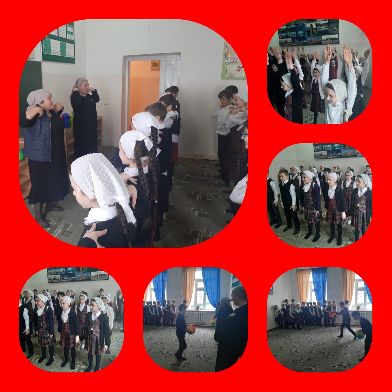 В МБОУ "СОШ N1 с.Закан-Юрт" учителя 4-х классов Лабазанова Л.Н. и Элипханова И.Б. в игровом кабинете проводят разминку на уроке физической культуры.