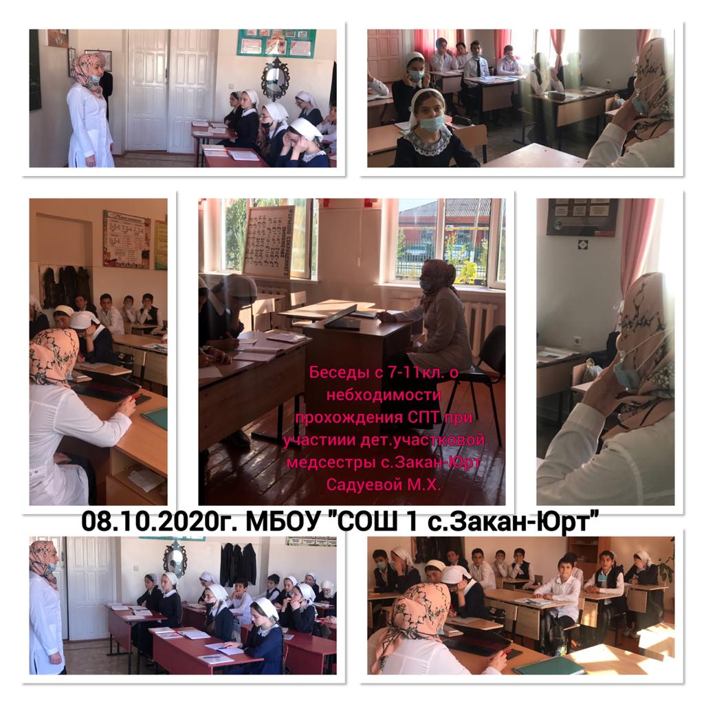 Беседы с 7-11 кл. о необходимости прохождения СПТ при участии дет.участковой медсестры с.Закан-Юрт Садуевой М.Х.