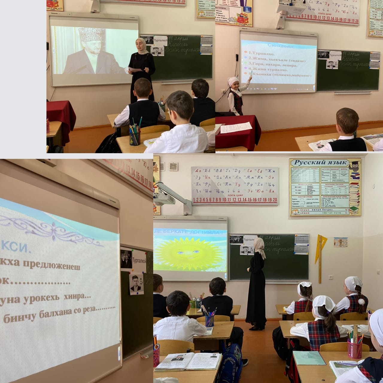 Учителем была проведена большая подготовительная работа, собран богатый материал с использованием интерактивной доски. Учащимся 1 класса были продемонстрированы фотографии известных чеченских героев (Б.Беноевский, Шейх Мансур, Абрек Зелимхан, А.Чеченский, П. Захаров).