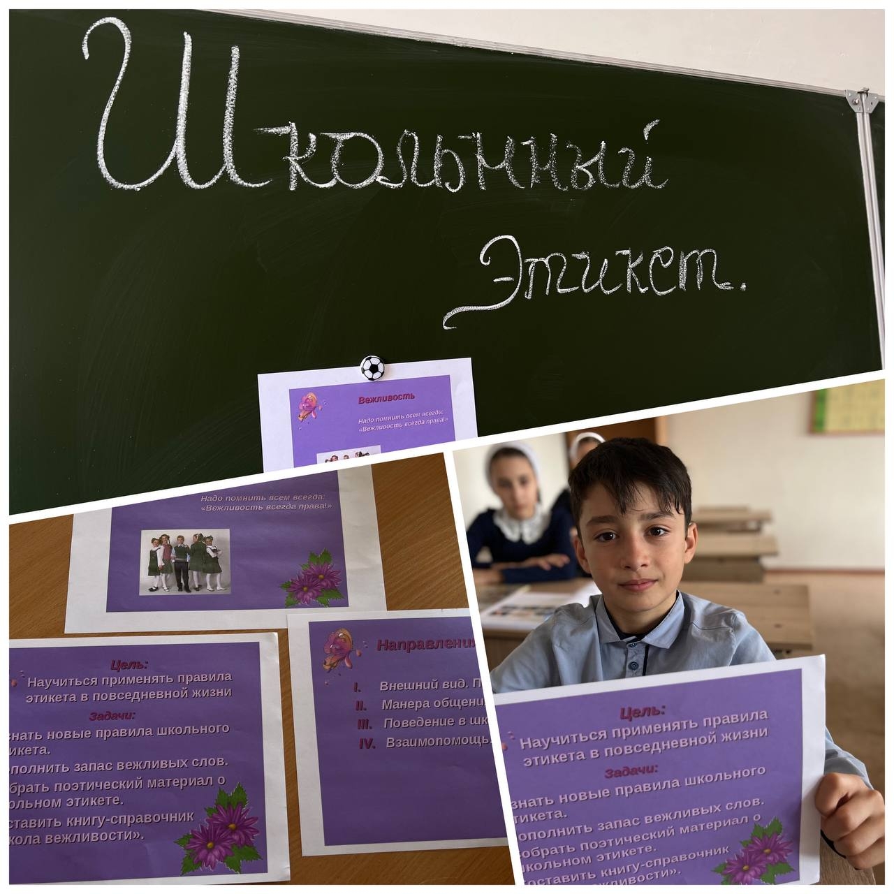 Активисты ЧРОО ЕДЮО «Юные Кадыровцы» Ачхой-Мартановского района провели беседу на тему «Школьный этикет». Цель: -Познакомить детей с понятием «этикет»; -Воспитывать культуру поведения; -Формировать основы социального поведения, этические и нравственные принципы; -Овладеть навыками культурного поведения ; -Усвоить основные этические требования в поведении и общении с людьми; -Закрепить знания учащихся о правилах поведения в школе; -Закрепить понятия «этикет» и «школьный этикет», познакомить с историей этикета; -Развивать внимание, мышление и речь учащихся; -Развивать умение анализировать свои поступки, поведение других людей и делать выводы; -Воспитывать самостоятельность, честность, ответственность, взаимопомощь. _____________________________ ЧРОО Единая детско-юношеская организация имени Первого Президента ЧР, Героя России Ахмат-Хаджи Кадырова «ЮНЫЕ КАДЫРОВЦЫ» 📍ЧР, г. Грозный, пр. Путина 4. ☎️/📲 + 7 938 001 57 58 ✉️kadyrovcy9090@mail.ru