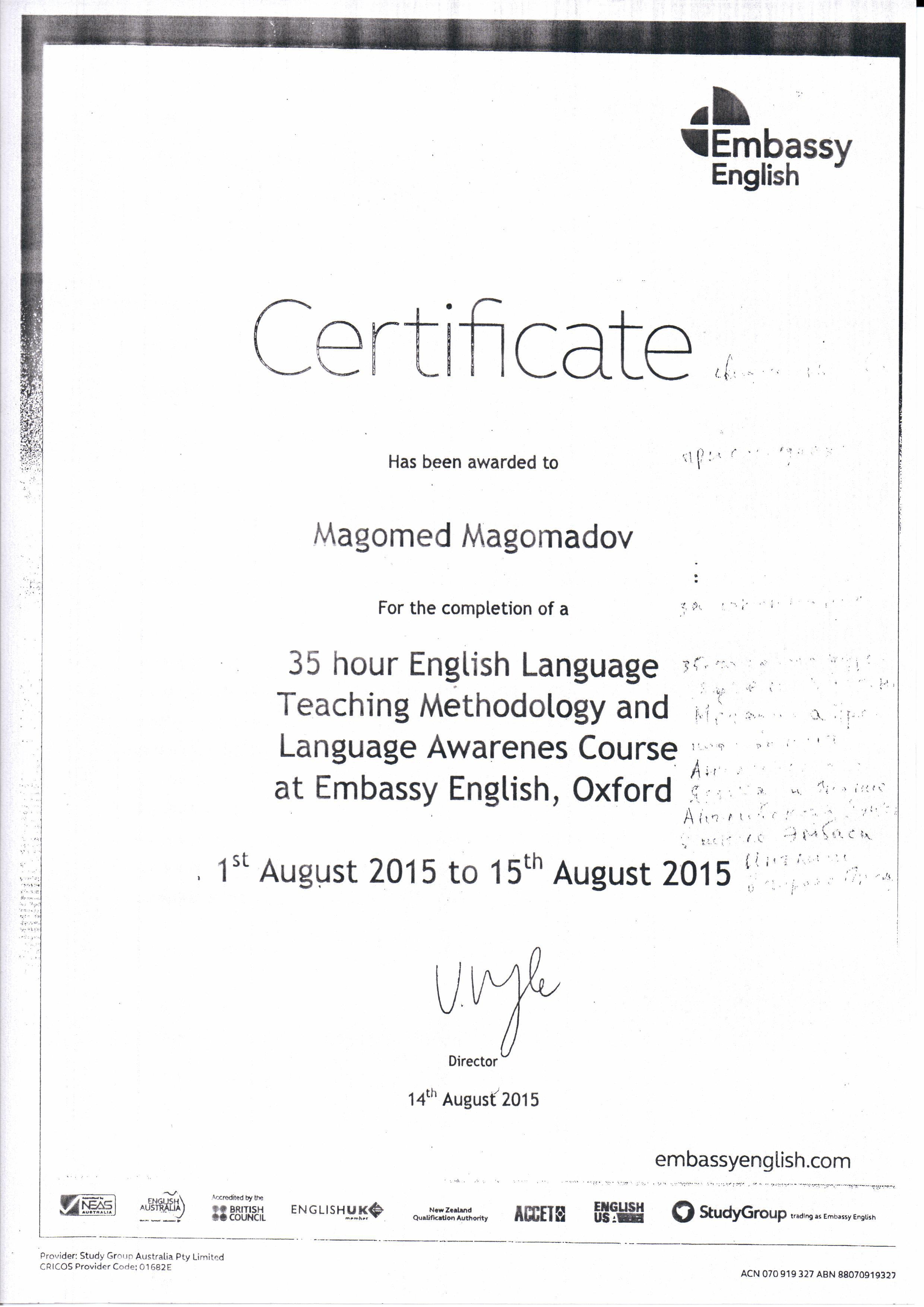 01.09.2015С 1 по 15 августа 2015 года учитель английского языка Магомадов Магомед Махмудович проходил 35-часовой курс по методике преподавания английского языка в Embassy English, Oxford, UK. По итогам обучения Магомадову М.М. был вручен соответствующий сертификат. Kэт Харгривз в разделе «Оценка учителя» отметила, что Магомед был очень добросовестным и серьезным членом класса, который, несомненно, стремится к дальнейшему развитию своих навыков как учителя. Презюмируется его очень профессиональное отношение к обучению и обширный диапазон методов обучения. Отмечено, что Магомед очень хорошо разбирается в основополагающих принципах английского языка и с высокой точностью обрабатывает язык.