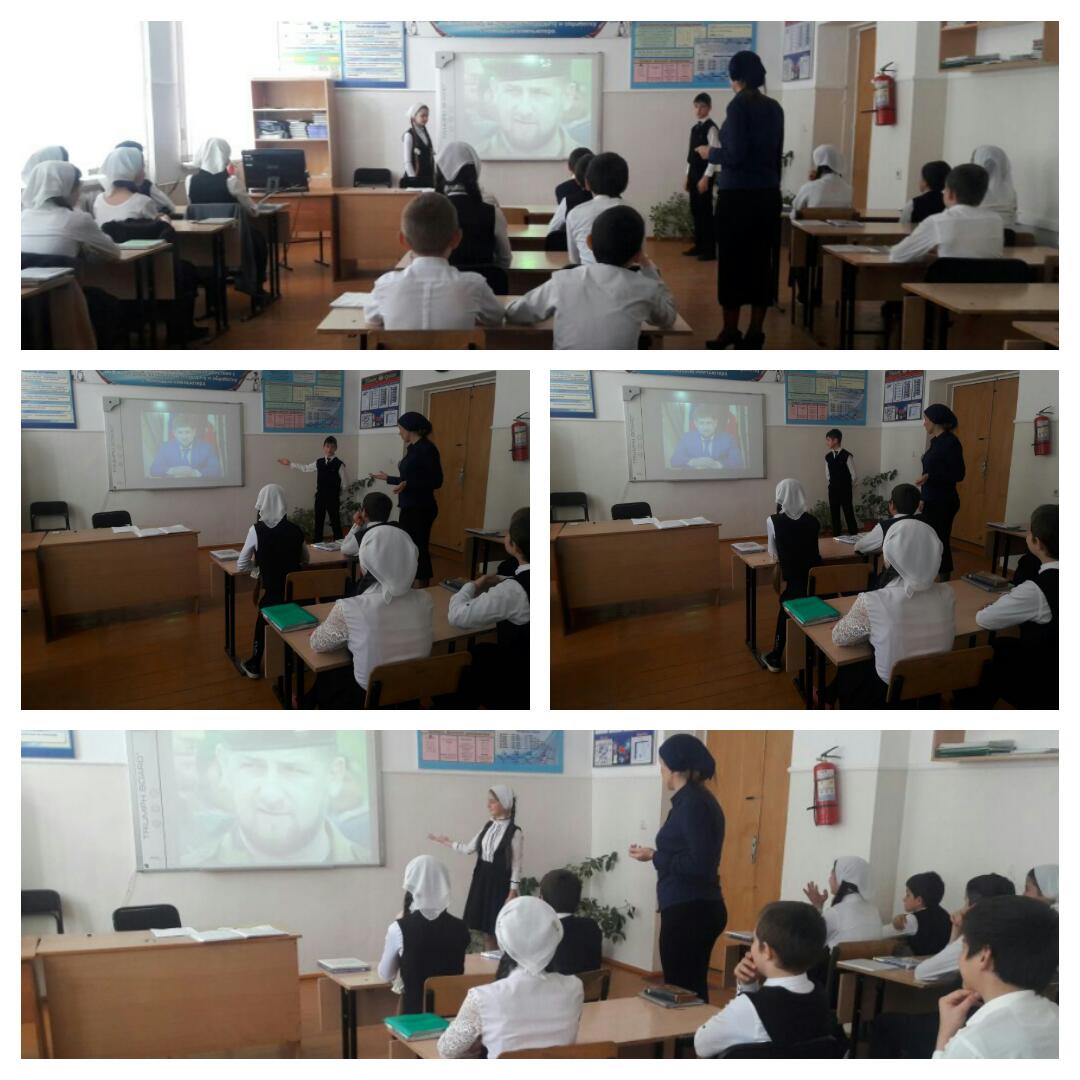 В рамках патриотического воспитания, в связи с празднованием в Чеченской Республике Дня мира, в школе прошли уроки мужества на тему: «Глава Чеченской Республики, герой Российской Федерации Р.А. Кадыров – инициатор отмены КТО», которые подготовила учитель истории Алханова М.Ш.