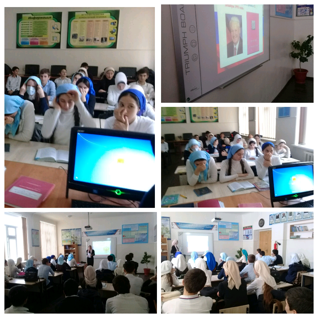 11.12.2017Целью мероприятий было способствовать личностному становлению школьника – патриота; стимулировать интерес к изучению своих прав и обязанностей; воспитывать уважительное отношение к законам своей страны и символике государства, сформировать понятия «закон, порядок, право». Были проведены беседы о нашей Родине с демонстрацией презентации; о Конституции; о законах и о правах граждан. Дети рассказывали подробно о символах государства. Все вместе исполнили под фонограмму гимн России. После этого перешли к основному – правам и обязанностям граждан. Учитель Учитель истории Расумова З.Ш. рассказала о дне, когда была принята Конституция – 12.12.1993г. Конституция - основной Закон страны утверждает свободу и справедливость, человеческое достоинство и благополучие, защиту семьи и Отечества, единство многонационального народа России не только как общепризнанные ценности, но и как юридические понятия. Права и свободы человека провозглашаются высшей ценностью. Признание, соблюдение и защита прав и свобод человека и гражданина – важнейшая обязанность государства.