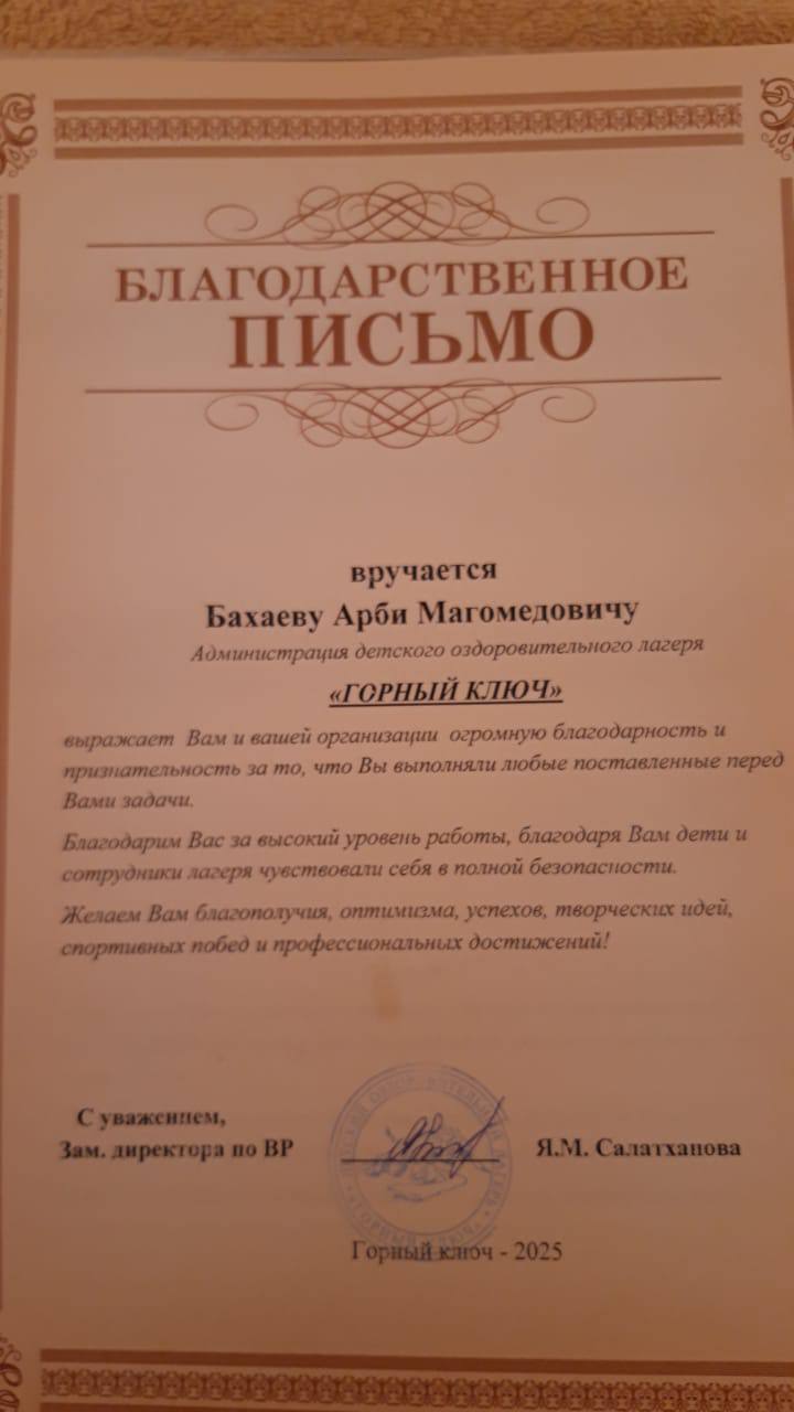 Иштта даггара баркалла ала лаьа, белхан г1уллакхна шайца тхо з1ене девлча, ларамца тхоьга дистхуьле сихха вайна т1едиллана белхан кхачамбацарш нисдешболчарна а. Везачу Аллах1а вай йуьхь1аьржонах лардеш, беркате йойла вайн белхан т1аьхье» - Такие слова благодарности мы получили от администрации «Горного ключа» в адрес нашего учителя Бахаева Арби,который сопровождал детей. Дала т1аьхье беркате йойла!