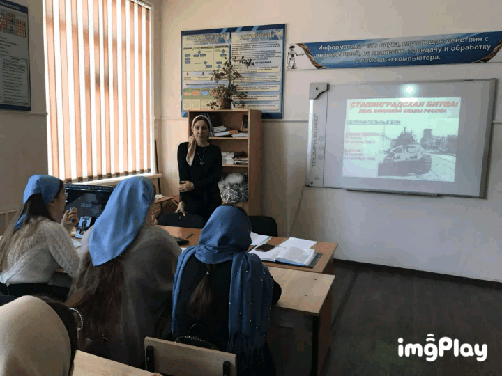 02.02.201802.02.2018г учитель истории Алханова М.Ш. совместно с зам. по ВР Юсуповой Р.М. провели урок в 11 классе: «Урок-мужества», посвященная 75-й годовщине Сталинградской битвы. На уроке говорилось о героизме мужестве наших земляков. Ознакомили обучающихся с историей своего края и расширили представление о Сталинградской битве.